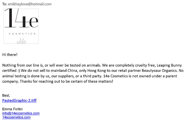 In order to ensure that a brand is completely cruelty free, doesn’t test on animals at any point during the production of their products, I reach out to them via email. Here is my email exchange with 14E…
